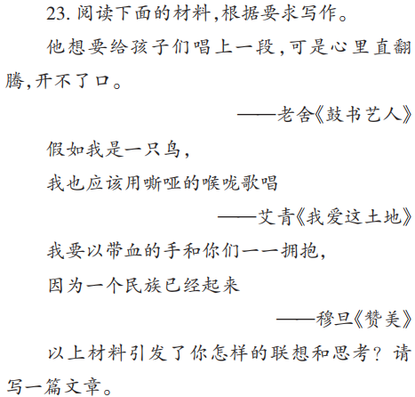 引用格式:教育部教育考试院. 强基固本 以文化人:2025年高考语文全国卷试题评析[J]. 中国考试, 2025(7): 83-88.摘 要:2025年高考语文全国卷命题以习近平新时代中国特色社会主义思想为指导,落实立德树人根本任务。试题弘扬社会主义核心价值观,紧扣时代脉搏,引导考生厚植家国情怀,增强文化认同,培养审美意识,促进全面发展。同时紧密衔接教材内容,深化基础性考查,注重引导考生强化语言积累,总结语言规律,提高语文素养。此外,试卷创新题型设计,通过开放性探究任务激发考生的问题意识,引导培养逻辑思维、辩证思维与创新思维,发挥高考的选才功能。关键词:高考;语文;内容改革;试题创新2025年教育部教育考试院共命制全国一卷、全国二卷两套高考语文试卷。命题以习近平新时代中国特色社会主义思想为指导,落实《教育强国建设规划纲要(2024—2035年)》的要求[1],坚持立德树人,强化思想引领,注重基础考查,着力思维赋能,彰显学科优势,促进学生成长,充分发挥高考的正向引导功能。一、坚持立德树人,加强价值引领2025年高考语文全国卷命题落实立德树人根本任务,弘扬社会主义核心价值观,传承弘扬革命文化,从中华优秀传统文化中寻找源头活水,同时紧扣时代主题和时代精神,广泛取材,巧妙设题,充分体现了以文化人的鲜明导向。(一)述往思来,厚植家国情怀爱国主义是中华民族的民族心、民族魂。在中华民族几千年绵延发展的历史长河中,爱国主义始终是激昂的主旋律,始终是激励我国各族人民自强不息的强大力量[2]。在中国人民抗日战争暨世界反法西斯战争胜利80周年之际,高考语文将深厚的家国情怀以贴近现实、贴近考生的方式,生动地呈现在试卷之中。全国一卷阅读Ⅱ的两个文本,引导考生不忘历史,从民族和国家浴火重生的历史中汲取经验和力量。文本一选自作家老舍所著长篇小说《鼓书艺人》。小说讲述了鼓书艺人方宝庆等人在抗战中流亡播迁的遭际,将他们的命运和前途与民族、国家的命运和前途紧密联系起来,寄寓了老舍对时代的深刻观察和对历史远景的展望。文本一为小说开头部分,描摹了难民们心力交瘁的逃难过程。文本二选自《我为什么离开武汉》,节选的是老舍自述以文报国志向的部分。两个文本能够让考生体验抗战中的艰难困苦,体会老一辈作家的爱国热情和家国情怀,从而增强在新时代担负历史重任的使命感。全国一卷的作文试题以组合性材料的形式出现:材料一即来自同卷阅读Ⅱ文本一《鼓书艺人》,展现个体在历史洪流中的坚韧与温情;材料二选自艾青名篇《我爱这土地》,以“嘶哑的喉咙”隐喻苦难中的呐喊与不屈;材料三是穆旦诗作《赞美》中的名句,通过“带血的手”与“起来”的姿态指向集体抗争与民族新生。三则材料各有侧重,同时又相互交织,共同建构起中华民族近现代历史从“国家蒙辱、人民蒙难、文明蒙尘”到奔走呐喊、救亡图存,再到振兴中华、民族自强的叙事背景与阅读语境,为考生提供多维度的立意空间,引导考生在理解材料内涵、获得情感共鸣的基础上,结合自身积累与感悟进行写作。考生可以从审美体验出发,思考三则材料的内在关联,回望历史、展望未来,对个体与集体、平凡与伟大、苦难与希望、历史与未来等关系进行深入思考,形成对民族魂丰富意蕴的深刻体认。(二)扎根本土,弘扬传统美德在5000多年文明发展中孕育的中华优秀传统文化,积淀着中华民族最深沉的精神追求,代表着中华民族独特的精神标识,是中华民族生生不息、发展壮大的丰厚滋养,是中国特色社会主义植根的文化沃土[3]。2025年高考语文全国卷试题从中华优秀传统文化资源中精心取材,挖掘其中蕴含着强大感召力的“文化密码”,在考查语文能力的同时,实现对考生的精神浸润。例如,全国一卷阅读Ⅳ选取北宋王安石的七律《元珍以诗送绿石砚所谓玉堂新样者》作为阅读材料。这是诗人在收到朋友赠送的石砚及赠诗之后写的一首唱和诗,诗歌从石砚的“坚”联想到友人的“心”,表达了对身处逆境的友人高尚品质的赞美。通过此诗,考生可以窥见古代士人的生活方式和彼此之间的交往,感受他们“穷且益坚,不坠青云之志”的高尚情操,加深对中华优秀传统文化的理解。试题在充分挖掘中华优秀传统文化资源的基础上,深入阐发了其中重要思想理念的时代价值。例如,全国二卷阅读Ⅲ的两则材料就涉及对古人“孝道”的思考和理解。从材料一中可看出,郗愔极为孝顺,又忠于王室,符合古人心目中理想君子人格的基本要求。而其子郗超尽管才干过人,且对自己的父亲极为孝顺,但他不忠于王室,追随桓温谋划废立之事。材料二中东坡先生比较父子二人的行事,提出“君子之孝”“小人之孝”之别。在古代社会,大孝即是忠君爱国。郗超只知孝顺父亲,而于大节有亏,他的“孝”属于“小人之孝”。习近平总书记指出:“在家尽孝、为国尽忠是中华民族的优良传统。”[4]对此,两则材料在今天仍然有积极的启示意义,可以引导考生正确看待、辩证认识、理性分析现实问题,在大是大非面前旗帜鲜明,恪守正道。(三)以美育人,促进全面发展中共中央办公厅、国务院办公厅印发的《关于全面加强和改进新时代学校美育工作的意见》,明确提出美育是丰富想象力和培养创新意识的教育,能提升审美素养、陶冶情操、温润心灵、激发创
