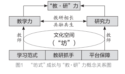 / 文|邵文鸿 1 李政淼 1、2 段春炳【摘 要 】教师是立教之本、兴教之源。学校创建教师文化认同的工作“坊”,可以高质量培育教师的“教·研”力。“坊”是教师高质量发展的基座,是一种促进教师发展的融合机制,是一种教师成长的文化空间;“教”是遵循教学改进规律和提升教师教学力的路径构建;“研”是基于真实问题解决的科学研究范式,是提升教师研究力的重要“历程”。【关键词】“坊式”成长“教· 研”力 课题化运行 专业化卷入生态化规范 为了满足初中教师课堂教学能力与素养提升的需求,浙江省杭州市富阳区永兴学校初中部基于学校实践,建构了“坊式”成长的校本教研模式,探讨了“坊式”成长的意义与价值、内涵与关系、框架与解释。 一 、初中教师课堂教学能力与素养提升的需求分析《中共中央国务院关于弘扬教育家精神加强新时代高素质专业化教师队伍建设的意见》明确指出,将学科能力和学科素养作为教师教书育人的基础,贯穿教师发展全过程[1]。如何发展初中教师的能力和素养?通过对初中教师“课堂教学能力与素养提升”的需求分析,笔者认为主要表现在以下三个方面。1. 高质量的活动:从常态程序到专业运行公开课是教师课堂教学力提升的重要抓手。教研活动的一般程序是:选择上课人员—商定听课时间—集中听评课,这已成为一种固化的操作方式。但这种教研活动的效益究竟如何?实际上,更多时候,教师就是为了完成规定的任务。承担公开课的教师备课质量如何把关,其他教师可以为上课教师贡献什么智慧,如何提升教师的听课质量,如何进行高水平的点评以更好地改进教学,应成为公开课活动中的生产力。2. 研究力的生长:从工作视角到学术引领常规的研讨活动基本遵循“课标解读—内容分析一学法探讨一任务分工”的环节,备课组长在一定程度上应承担指导者的角色,引领其他教师的发展,但做得更多的是教学工作的安排、教学任务的布置,“教研”的成分相对较少。从学术的角度来说,备课组长的能力相对“欠缺”。毋庸置疑,教师研究力的 短板限定了其教学力的提升空间。如何让教师的日常教学从工作视角转变为学术引领,如何让“研究”成为教师教学力提升的“楔子”,如何引入专家智慧助力教师的教学研究,是迫切需要解决的难题。3. 教学力的呼唤:从个体行为到共同成长学校教研部门一般分为三级架构:教务处/教科室—教研组—备课组。教师的教学活动往往自上而下,有的来自专家“热点问题”的研究,有的来自上级教育部门的任务布置,有的来自学校教务处的教研主题安排等。尽管各级各类教学研讨活动是为了培养教师,但最大受益者是承担研讨课的教师,大部分教师基本处于“局外人”的状态。如何让所有的教师都“卷进”本土的教学研讨活动中,让他们承担不同的角色以促成教学力的共同提升,已成为教师发展面临的重要课题 。基于此,“坊式”成长就显得格外有价值。一是文化积累,有助于特色教研机制培育:让教师教与研的 活动专业化运行,形成一套可操作、行之有效的教研范式;二是整体代入,有助于教师教研能力提升:能 把全体教师都代入到自身的教学角色中去,实现教与研的相互转化,为教师“教·研”力的快速提升高效赋能;三是教学增值,有助于学生学业质量提高:教师课堂“教·研”力的提升直接赋能教学质量,提升 学生的学业水平和学科素养。 二、“坊式”成长的内涵与关系何为“坊式”成长?什么是“教· 研”力?二者之间究竞具有怎样的逻辑关系?1. “坊式”成长:学研共同体共同体的概念源自社会领域,学习共同体是其向教育领域的移植,研修共同体是其进一步聚焦到教师教育领域的表现。具体而言,研修指集教研、科研、培训于一体的继续教育活动,共同体在该语境中指由某个或多个学段构成的互助集体[2]。“坊”原指小手工业者的工作场所或物理空间。这里的“坊”是指教师共同协作的一个文化“空间”,是一个“小范围”的学研共同体,包含“人”和“机制”两个核心要素。“人”是指由老、中、青三层次同学科或跨学科教师组建的教学团队,包括坊主和坊员;“机制”是指旨在培育教师教学力和研究力的运行方式,包含学习范式、教研抓手和平台保障等。所以,“坊式”成长即一个突出团队高质量发展的操作模型,内核是基于教师文化认同的教研相长 。2.“教 ·研”力:相互作用场“教·研”力包含两个场域:一是教学力,是指教师的课堂教学能力或实力,它包含专业的备课、说课、上课和评课等知识与素养;二是研究力,是指教师着眼课堂教学真问题,基于学术视角研究解决的功力,它包含如何发现问题、提出研究问题、寻找学术支撑、制订研究方案、形成解决路径等能力。“教” 与“研”是教师“课堂生活”这枚“硬币”的两面,立足教学实践的“研”与学术研究式的“教”,共融共生,相互作用,双向赋能,形成合力 。 综上所述,通过“坊”这一文化空间的营造,构建起教师教学力和研究力互哺生长、双向奔赴的实践路径。“坊式”成长与“教·研”力的概念关系见图1。三、“坊式”成长的框架与解释如何以“坊式”成长为底座高质量培育教师的教学力和研究力?笔者基于“坊式”成长和“教· 研”力的内涵与关系,围绕“教”“研”“坊”三个内容进行了理性构建(